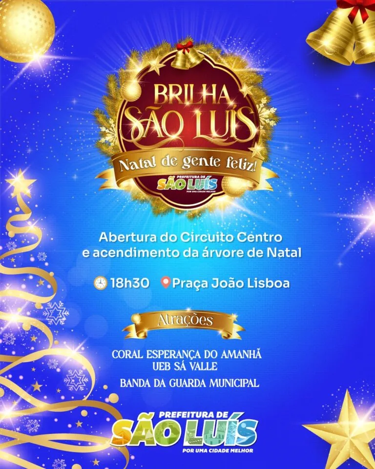 A Prefeitura de São Luís segue com a programação natalina do “Brilha São Luís, Natal de Gente Feliz” e promove, nesta quinta-feira (7), às 18h30, a abertura do circuito natalino que ocupa o Largo do Carmo, Praça João Lisboa, seguindo pela Rua de Nazaré, Praça Benedito Leite, além da fachada do Palácio La Ravardière.